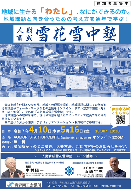 青森商工会議所では、社会・地域課題の解決について、対話や講義を通じ、共に学び、考える場を作り、新ビジネスや地域おこしに取り組んでいく人財が育つよう、青森中央学院大学特任教授の中村陽一氏を塾頭に、オール株式会社代表取締役の山崎宇充氏をコーディネーターにお迎えし、「人財育成 雪花雪中塾」(月1回程度)を開催いたします。